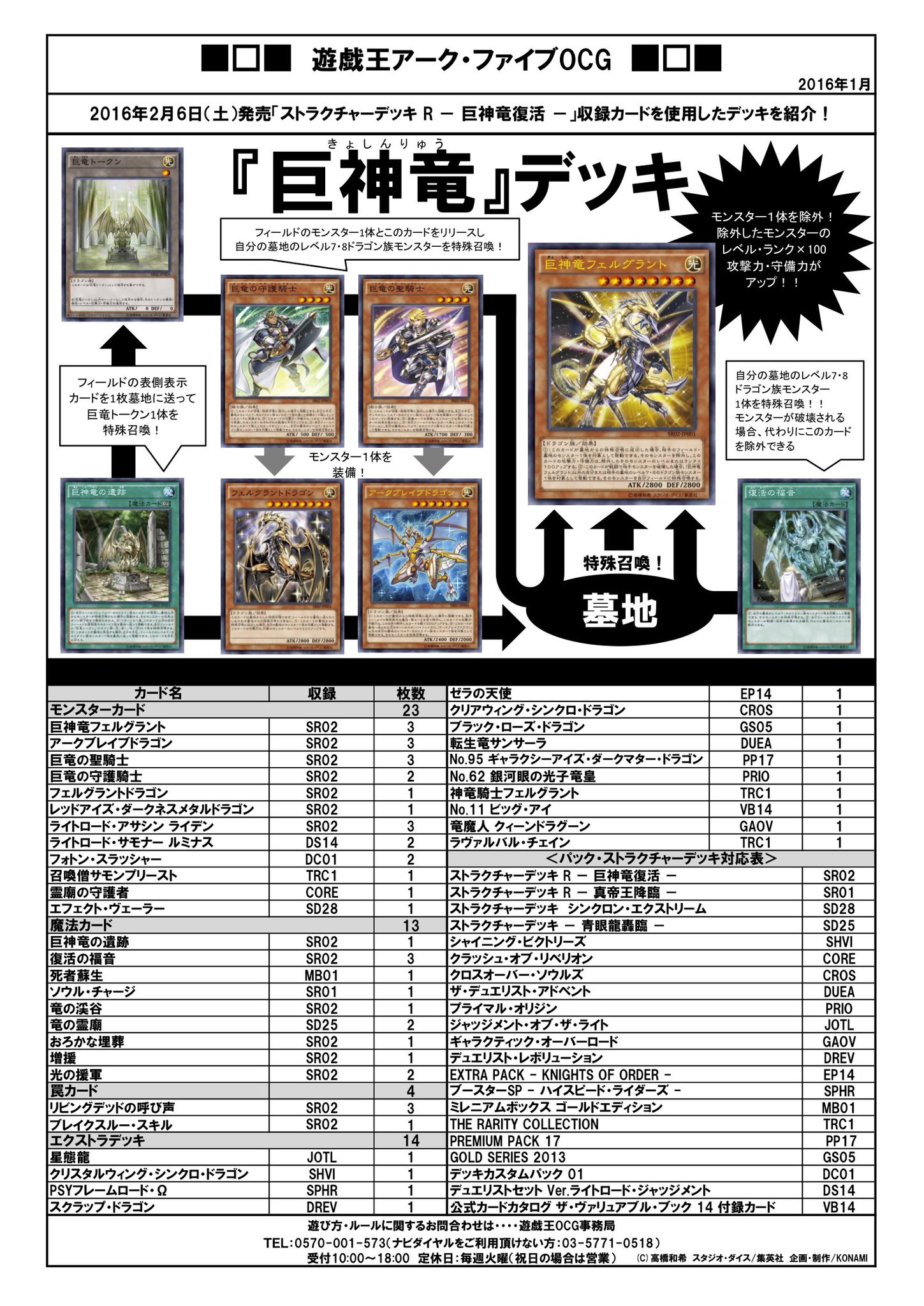 16年2月6日 遊戯王ocg「structure deck r 巨神竜復活 」発売 新カード6枚の印象です! ・巨神竜フェルグラント ・アークブレイブドラゴン・巨竜の聖騎士ひ ・巨竜の守護騎士・巨神竜の遺跡 ・復活の福音 大きく3グループに分かれているので、それぞれ考察していきます。ストラクチャーデッキ巨神竜復活は既に3箱予約済みです笑 復活の福音目当てですね。最近青眼デッキを組みたいと考えてますので。 通常魔法 (1):自分の墓地のレベル7・8のドラゴン族モンスター1体を対象として発動できる。ストラクチャーデッキ r (アール) - 巨神竜復活 (きょしんりゅうふっかつ) - † before:ストラクチャーデッキr-真帝王降臨- next:ストラクチャーデッキr-機械竜叛乱- 16年2月6日発売。 略号は「sr02」。 ストラクチャーデッキ-巨竜の復活-のリニューアル。